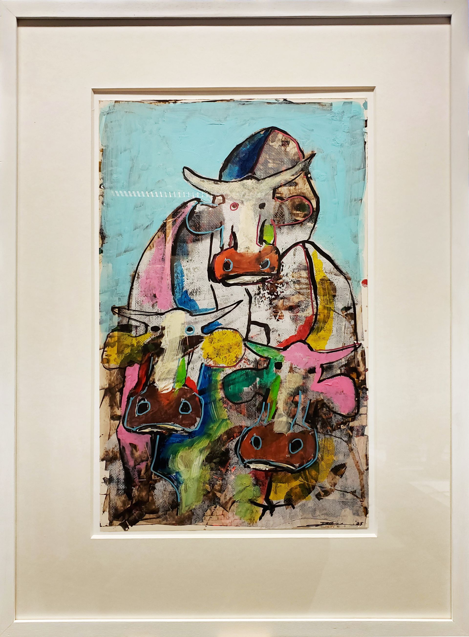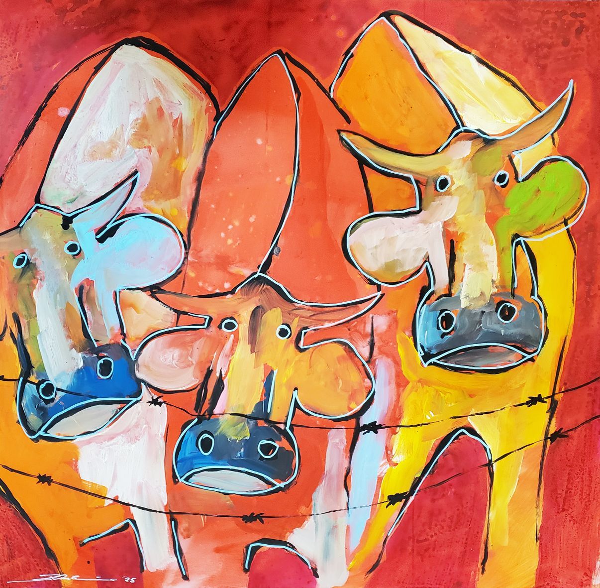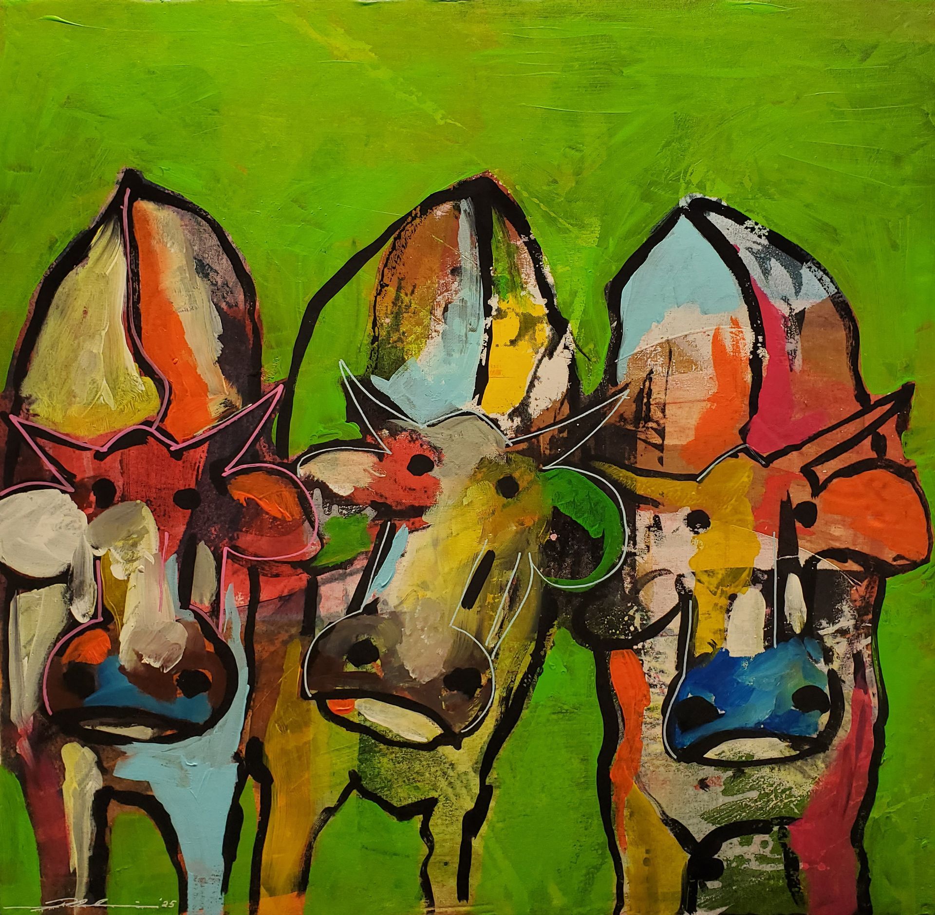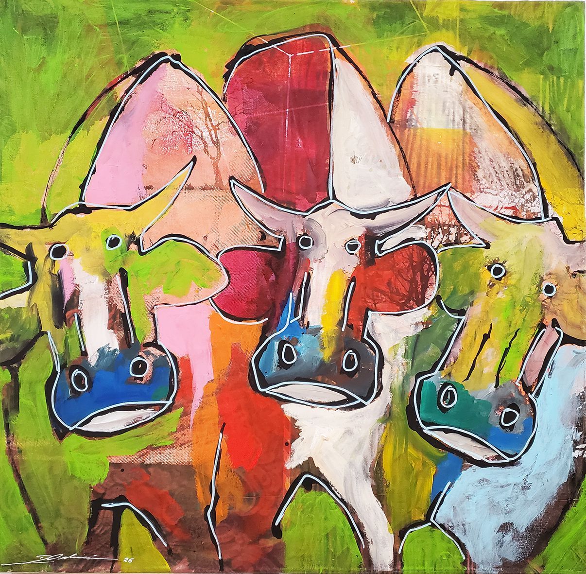 In these new works, the cows are more than just animals; they become expressive personalities. Their faces, painted in intense blues, yellows, and reds, reveal a playful mix of curiosity, calmness, and humor. The broad brushstrokes and dynamic contours give each figure a distinct energy — somewhere between abstraction and figuration. The background remains open and light, allowing the characters to step forward, confronting the viewer directly with their gaze.