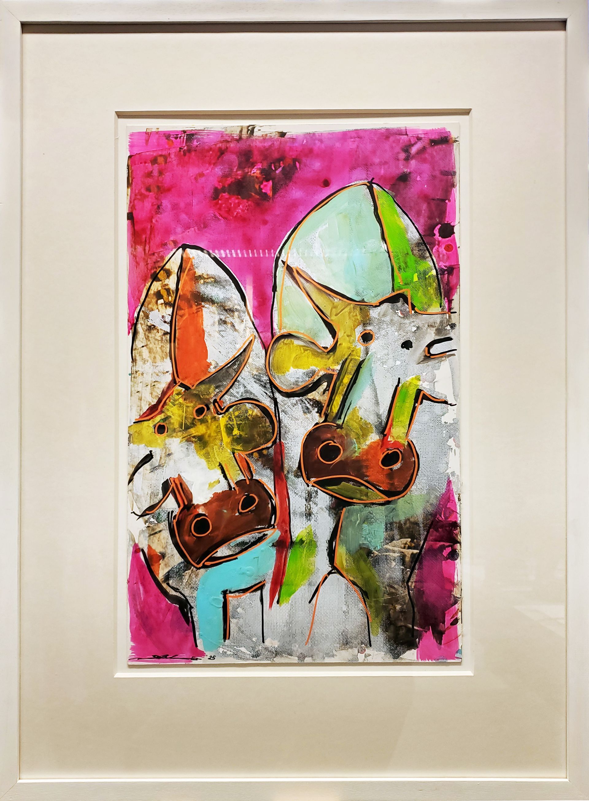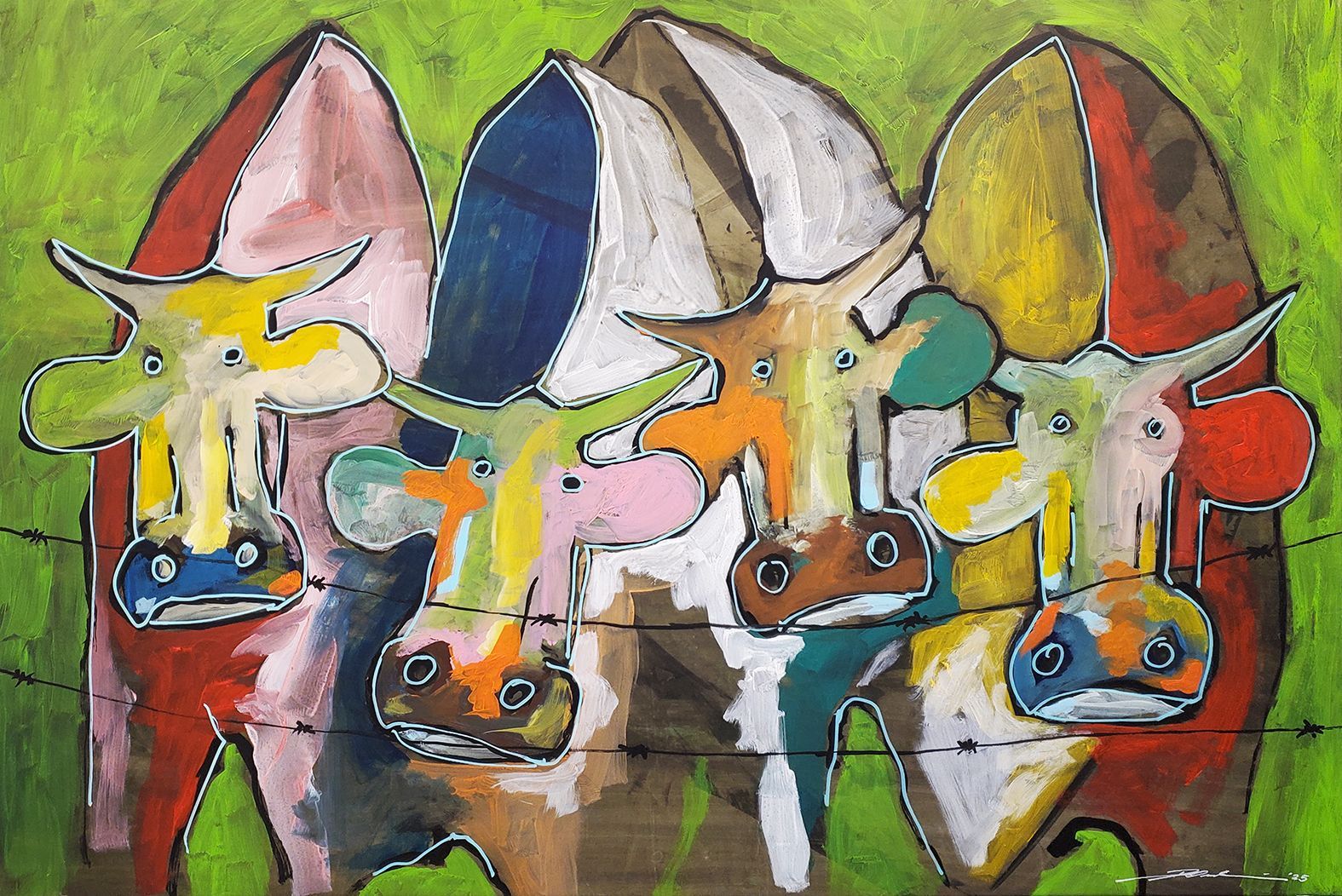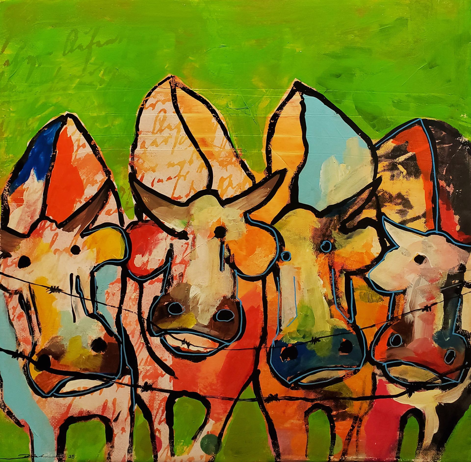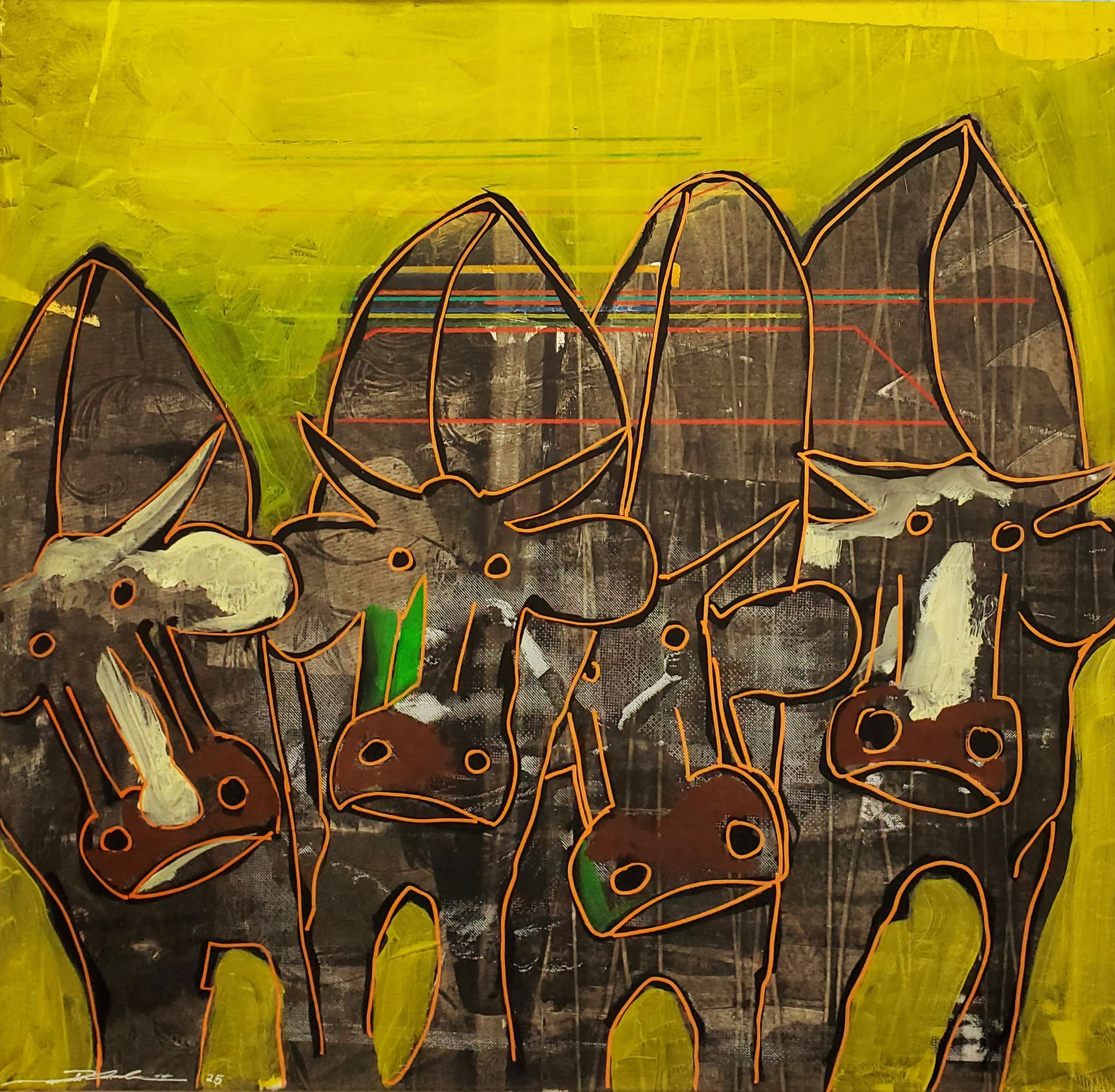 In these new works, the cows are more than just animals; they become expressive personalities. Their faces, painted in intense blues, yellows, and reds, reveal a playful mix of curiosity, calmness, and humor. The broad brushstrokes and dynamic contours give each figure a distinct energy — somewhere between abstraction and figuration. The background remains open and light, allowing the characters to step forward, confronting the viewer directly with their gaze.
