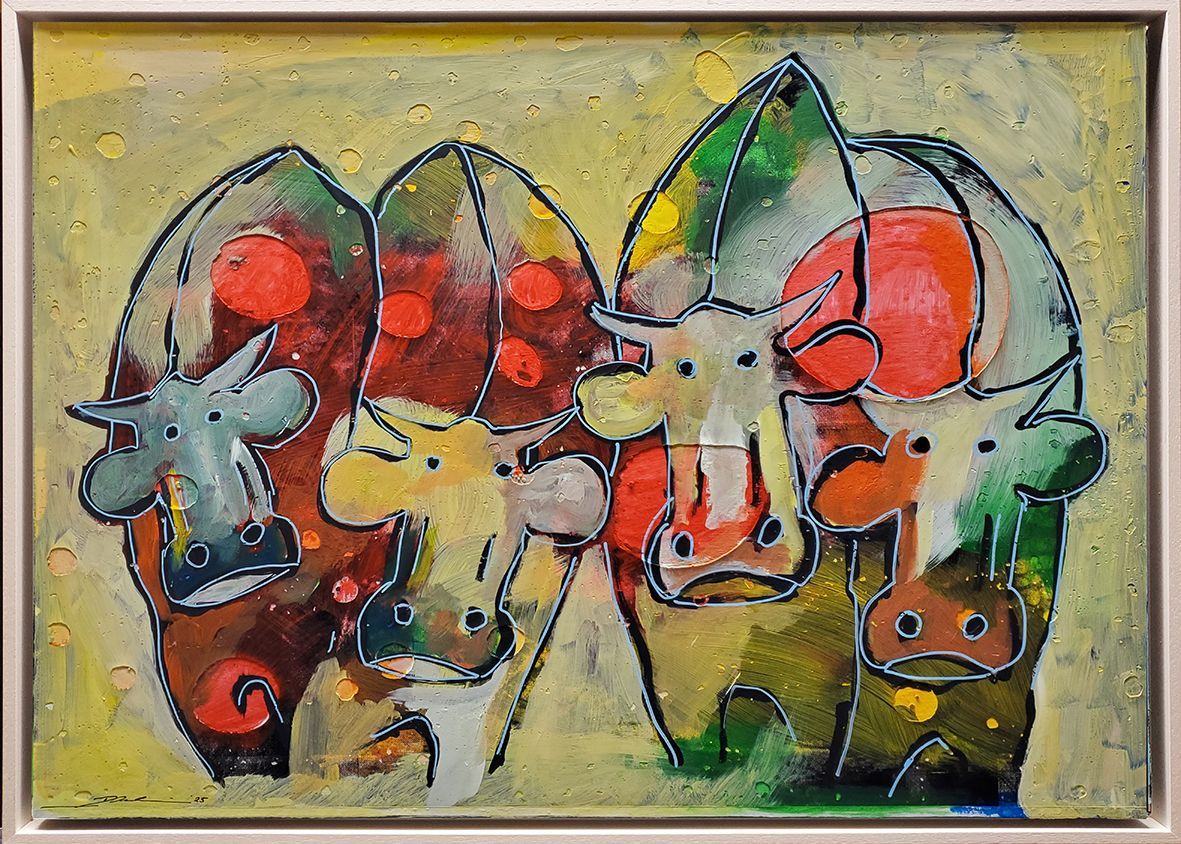 The new Kühe series is now presented at the Overhead Showroom in Obersgegen — a cheerful homage to the beginnings of an artistic journey, reimagined with the freedom and confidence of a mature painter.
